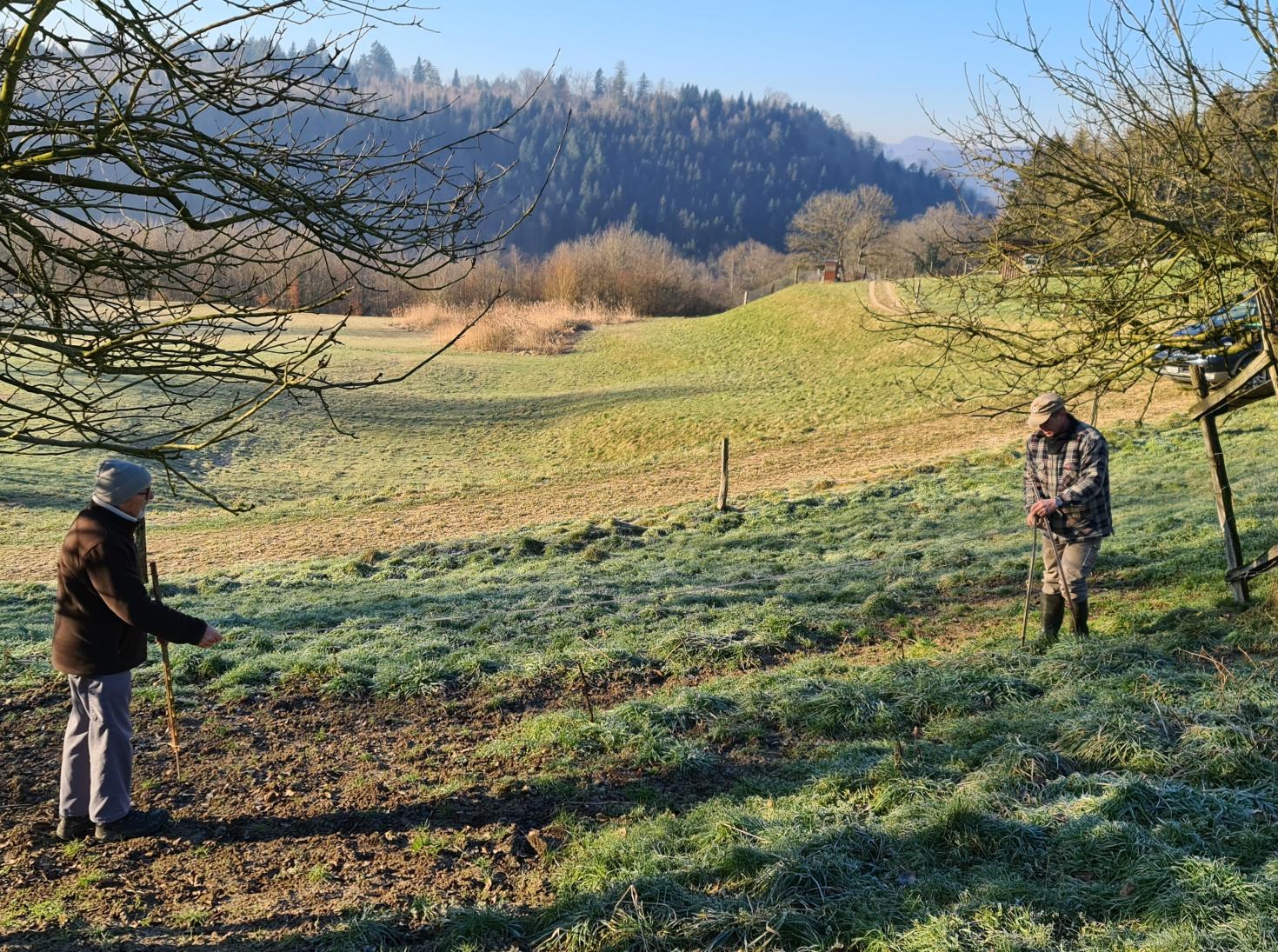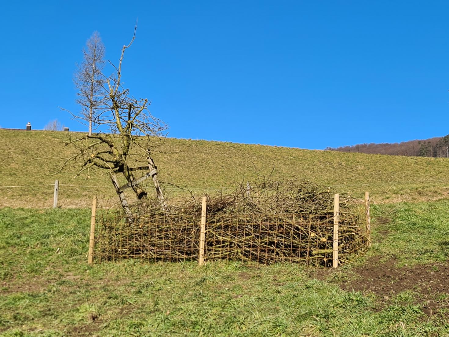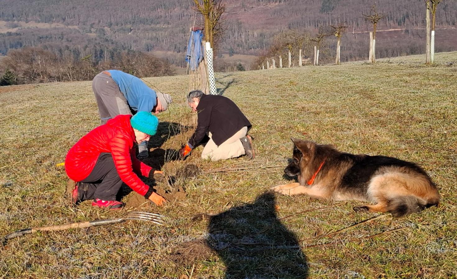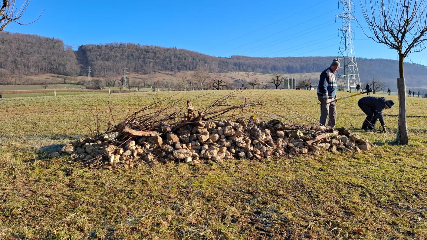 Das Wetter war fantastisch am 21. Januar morgens um neun. Es war kalt, der Boden noch gefroren, doch hoffentlich nur an der Oberfläche. Wir hatten einiges vor an diesem Tag. 14 tatkräftige Helferinnen und Helfer fanden sich ein. Ab und zu brauchten wir auch mal den Pickel, um ein genügend grosses Loch in die Erde zu graben, damit die insgesamt 180 einheimischen Pflanzen für einen Lebhag und zwei Hecken, die zusätzlich am Steilhang als Erosionsschutz dienen, gesetzt werden konnten. Auch mehrere Ast- und Steinhaufen wurden angelegt.